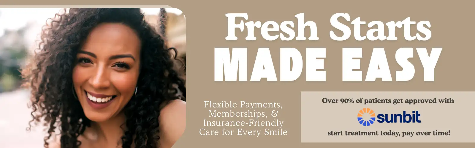 Fresh Starts Made Easy: "Flexible payments, memberships, and insurance-friendly care for every smile." Over 90% of patients get approved with Sunbit start treatment today, pay over time.